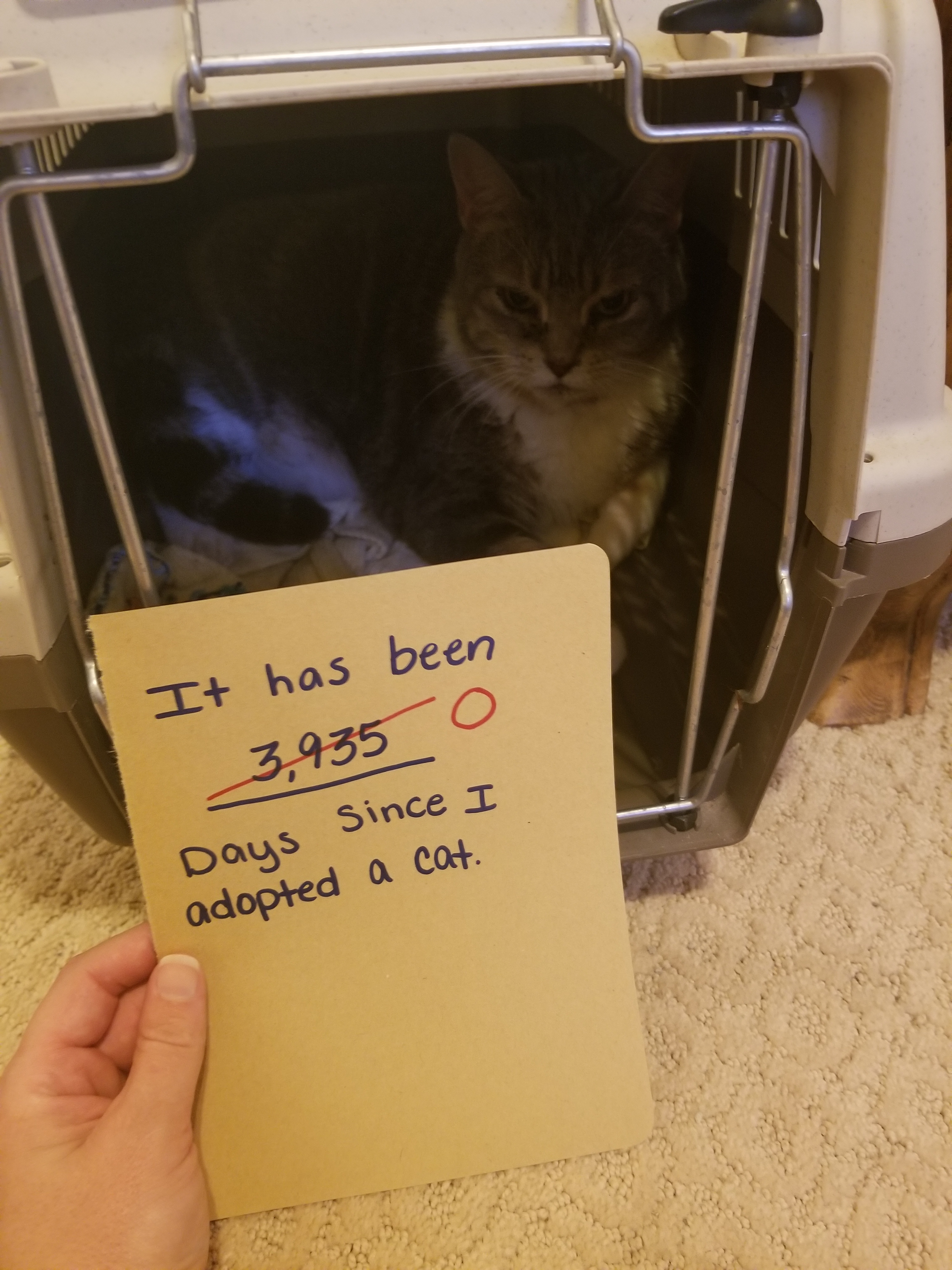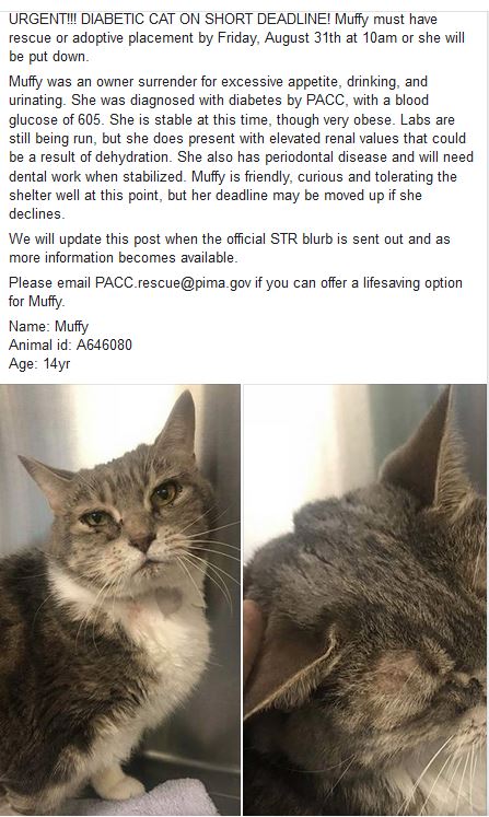I first met Muffy through this online post, which went up at 10am on August 30th 2018. I saw the photo and description and I thought “she has diabetes, infections, probably kidney disease, has bad teeth, is old, and is obese… She’s perfect!” And I meant that in the most sincere way. So, I walked into my bosses office and said “I need the rest of the day off. I have to go adopt this cat.”