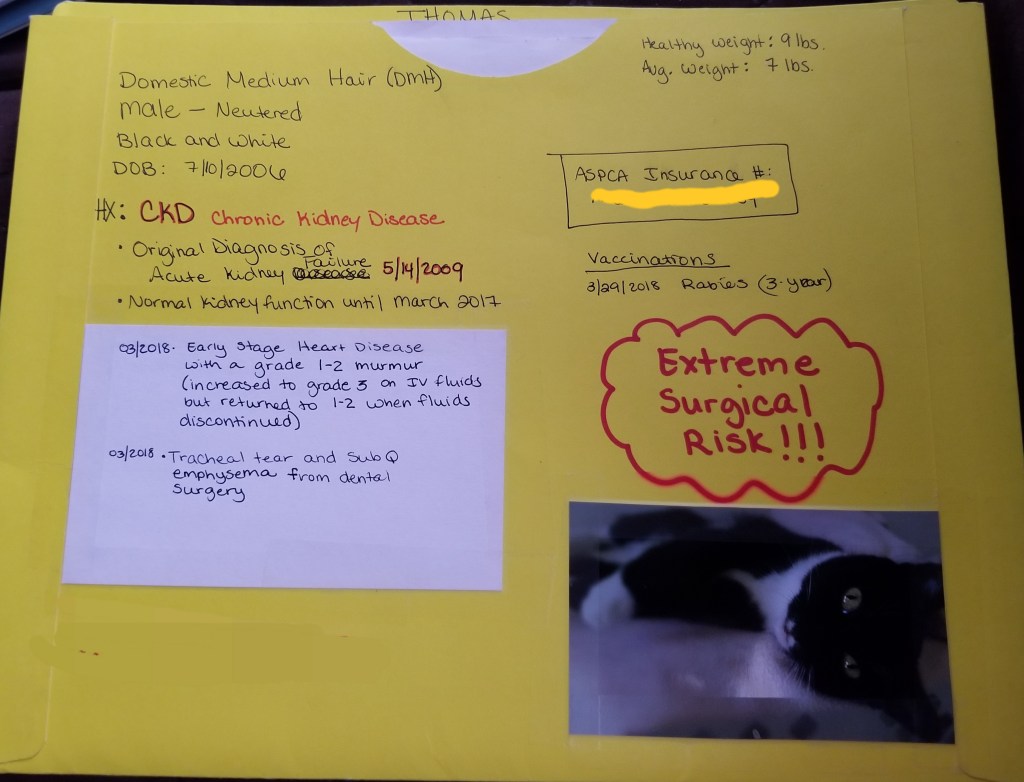 **The picture of the cat isn’t necessary for emergency room visits. I put pictures on the files so that if I die first someone else could quickly and easily match each one of my cats to their proper medical files. Though, if you have multiple cats the pictures can also help ER staff to recognize if you happened to grab the wrong file in your haste to get to the hospital.