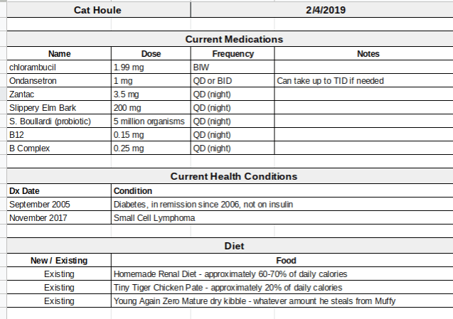 I keep this list on my refrigerator and take it with me to all regular and emergency vet visits. I have the clinic staff make a copy for their records and I bring the original back home.