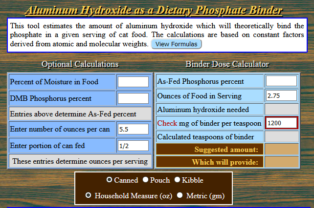 Using a hypothetical food that has 2.0% phosphorus and 10% moisture I would need to add 3 teaspoons (3600 mg) of Thriving Pets aluminum hydroxide to one measured cup of food.