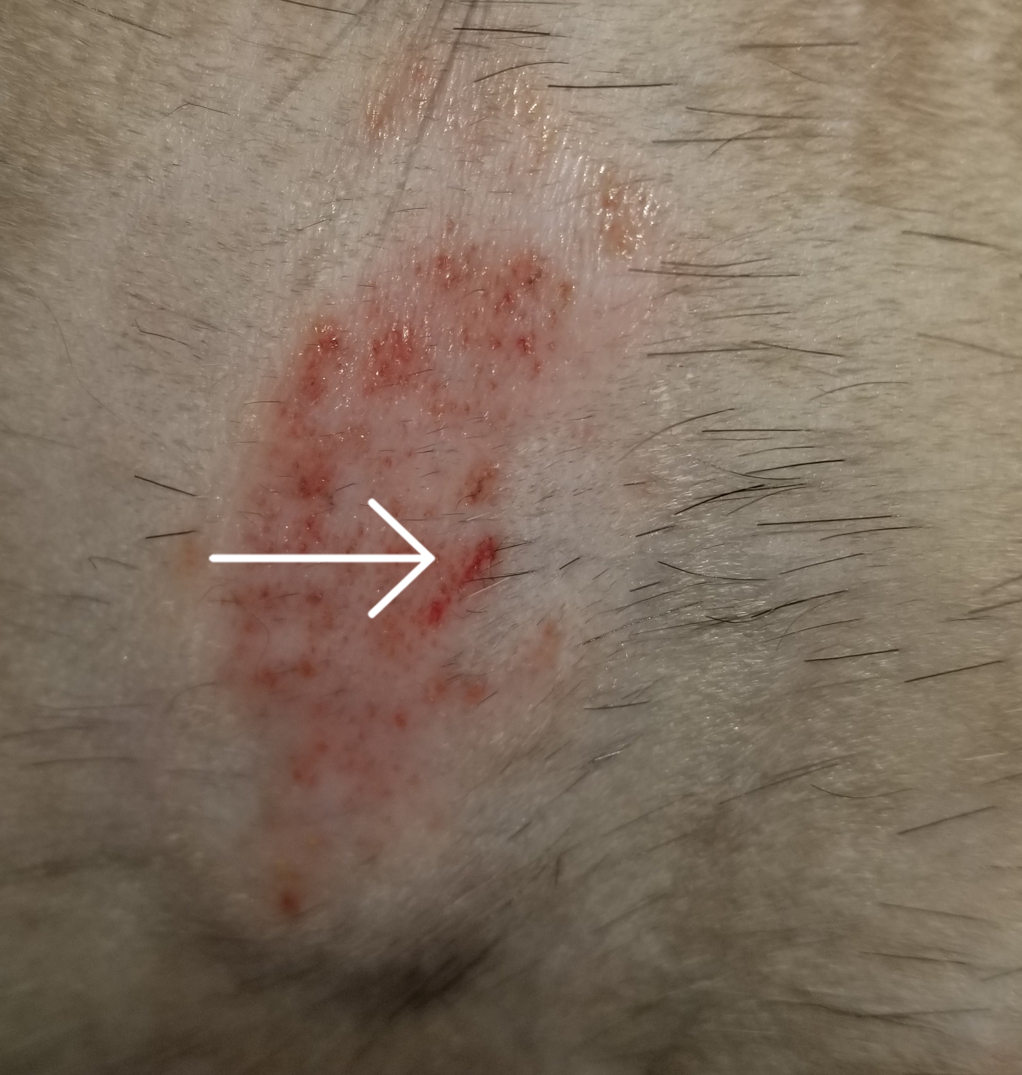 In this next photo you can see where the sensor was attached to Cat. The arrow is pointing to where the filament from the sensor was sitting. You can clearly see in this photo that the filament had been bent during the initial placement and was lying across the top of his skin horizontally, rather than poking straight down into it. This placement also explains why the filament ended up with glue on it when it should not have been exposed to glue at all.