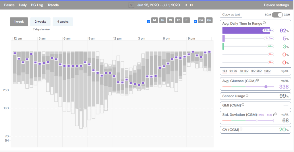 Here’s what 1 week of Oliver’s glucose levels look like. The purple dots are his actual readings during those time frames. As you can see, he does have a little bit of a curve, which is good, but his overall glucose levels are much too high.