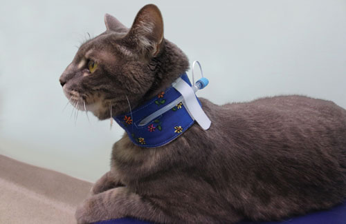 The most common reason for needing a covering for a cat’s neck is probably a feeding tube. For feeding tubes the absolute best cover I’ve seen is the Kitty Kollar.