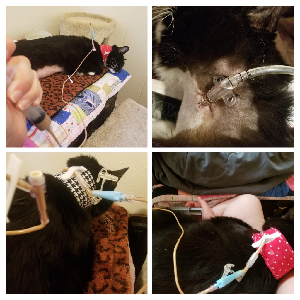 Oliver’s tube was placed on a Thursday morning and he was discharged from the hospital on a Saturday of the same week. Three days after coming home from the hospital he had to go back to them to have the placement of his tube checked because he started immediately gagging when I went to feed him a meal. That checkup, which involved xrays to make sure his tube was still correctly placed, cost an additional $450. And then, just 1.5 weeks later, he was back at the hospital again because he developed an infection at the tube insertion site. This visit ended up costing another $1,780 because the sutures holding his tube in place had come out because of how infected his neck was. Oliver had xrays to check the placement of the tube, surgical debridement (cleaning) to remove all the infected tissue, flushing the wound, sending a sample of the infection to the lab for a culture and sensitivity test for proper antibiotic selection, re-stitching the tube in place, and a 10 day course of a broad spectrum antibiotic. Then it was an additional $40 about a week later when the culture results came back and showed that he needed a different antibiotic to treat his infection. He will also need a second culture test after finishing his antibiotics to determine if the infection is gone. That test costs around $300.