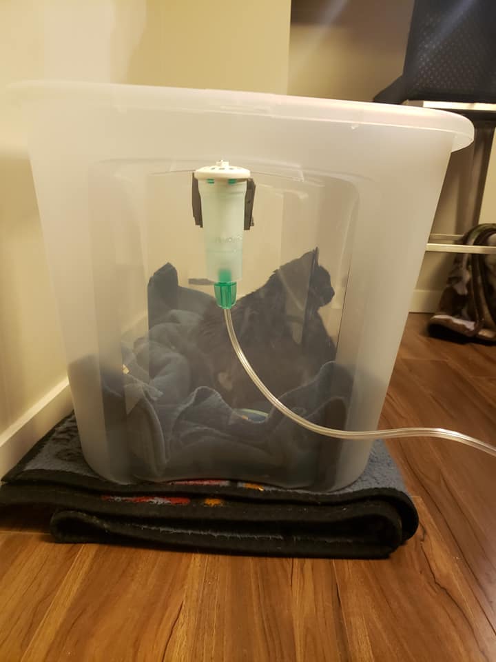 If your cat needs to be kept in an oxygen chamber you can construct one using the same method as making a nebulizer chamber from a storage tote, or you can purchase one.