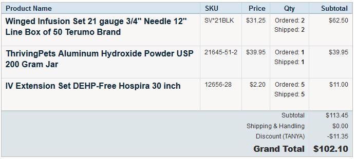 I very recently needed to place an order with Thriving Pets and here’s how I saved some money. In this example I effectively received 5 free IV extension lines, and saved an addition $0.35 on top of that.